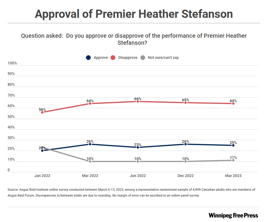 Premier Heather Stefanson has a 25 per cent approval rating, tied with New Brunswick Premier Blaine Higgs for last.