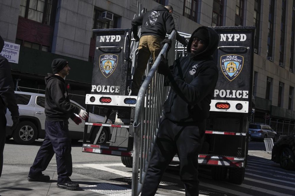 Barricades are unloaded from a truck near the courts in New York, Monday, March 20, 2023. (AP Photo/Seth Wenig)