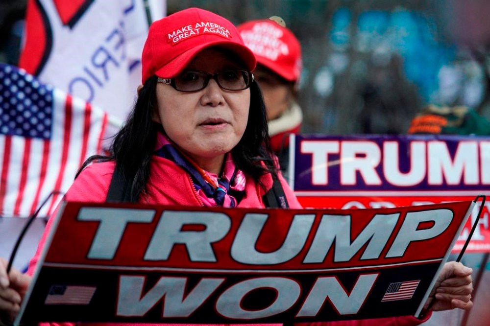 Stephanie Lu, of New York, stands in front of the New York Criminal Courts building criticizing New York County District Attorney Alvin Bragg and a possible criminal indictment of former President Donald Trump, on Monday, March 20, 2023, in New York. (AP Photo/Eduardo Munoz Alvarez)
