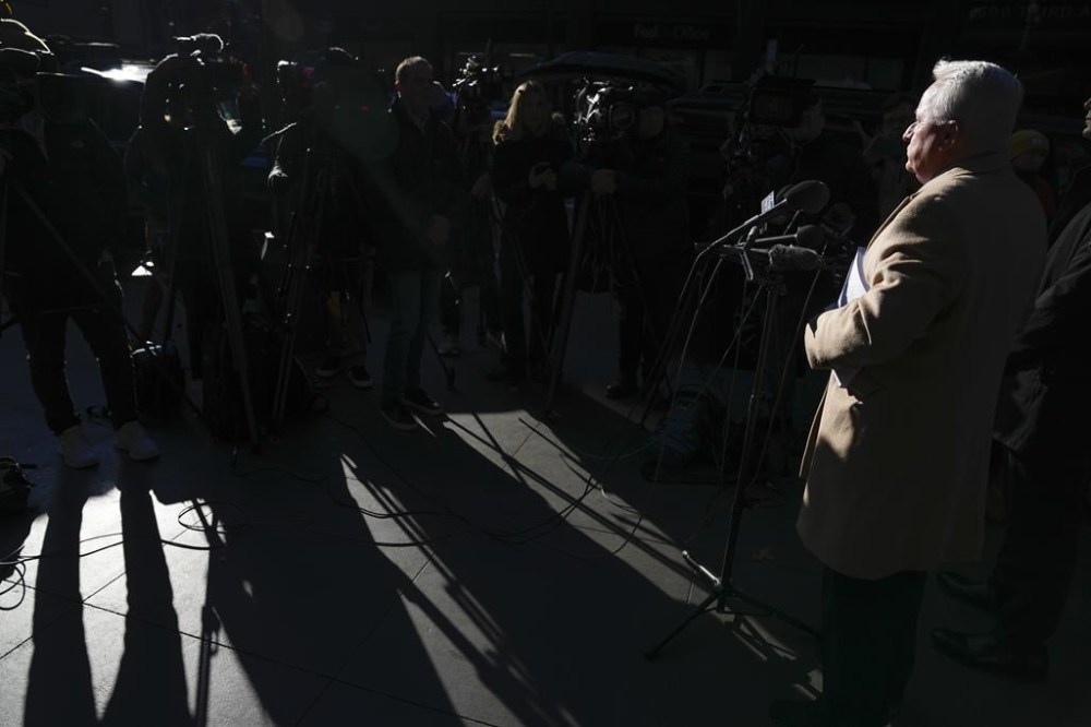 Attorney Bob Costello, right, talks to reporters after testifying before a grand jury investigating Donald Trump in New York, Monday, March 20, 2023. (AP Photo/Seth Wenig)