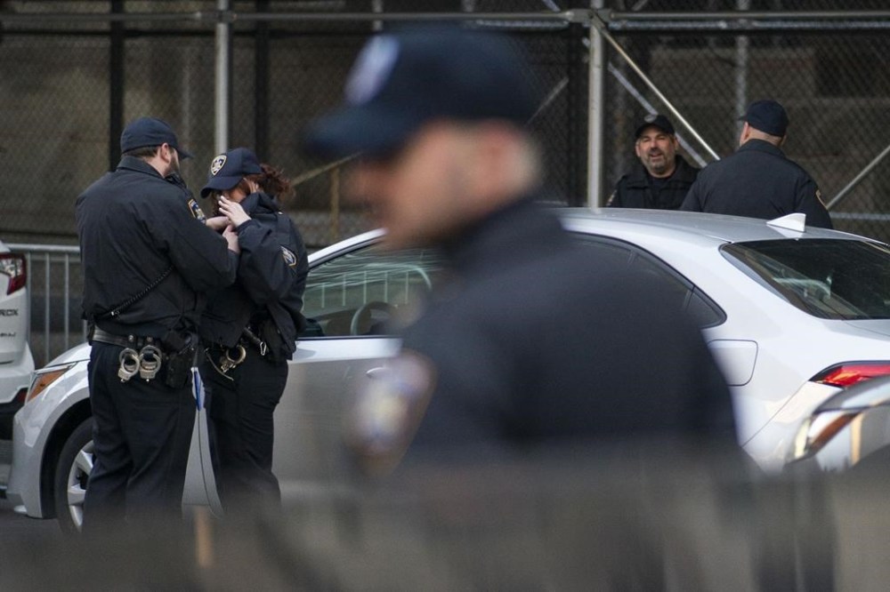 New York Police officers and New York State Court Police patrol around the courthouse ahead of former President Donald Trump's anticipated indictment on Tuesday, March 21, 2023, in New York. A New York grand jury investigating Trump over a hush money payment to a porn star appears poised to complete its work soon as law enforcement officials make preparations for possible unrest in the event of an indictment. (AP Photo/Eduardo Munoz Alvarez)