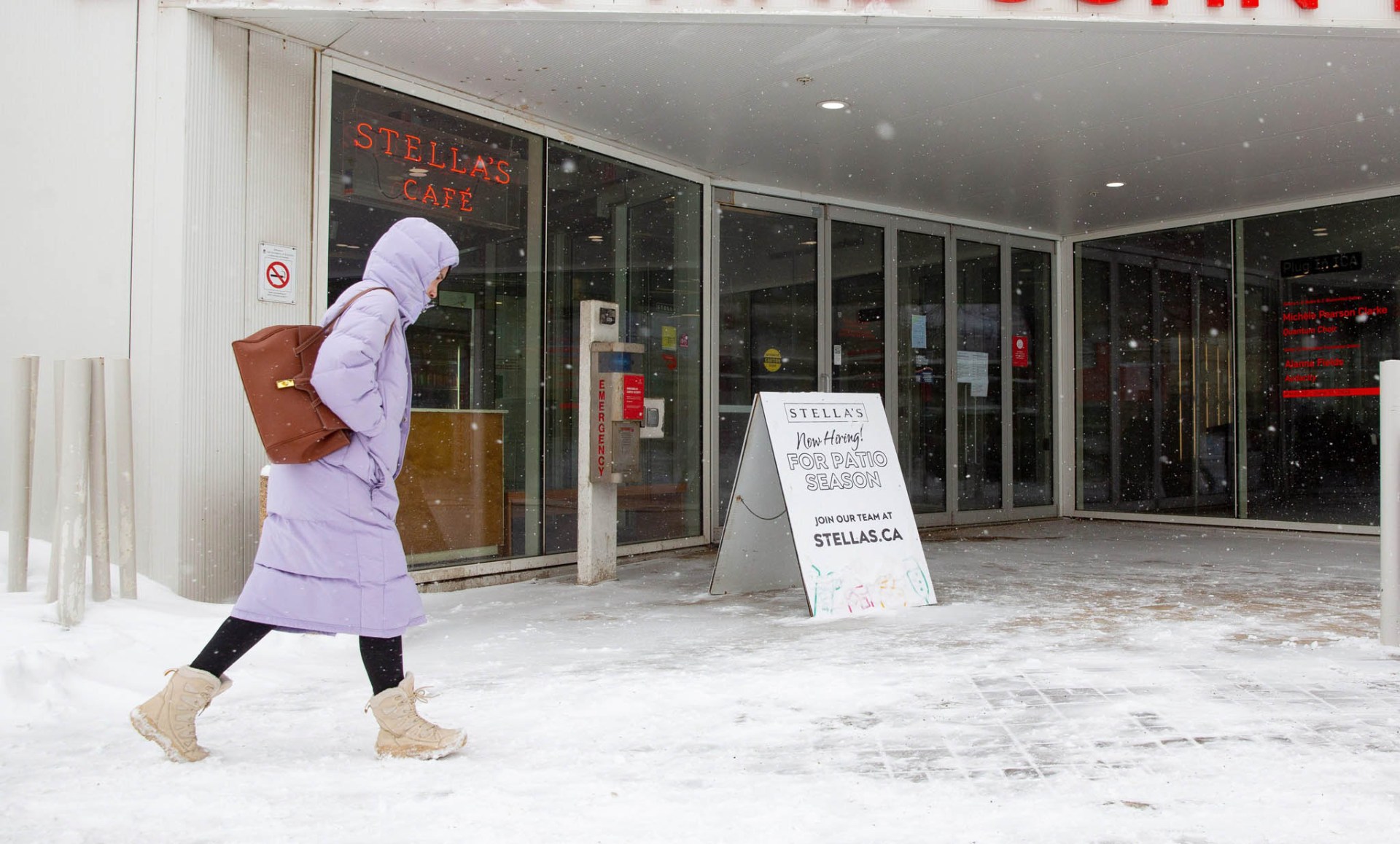 People walk past a sign advertising spring patio employment opportunities at Stella’s on Portage Avenue.