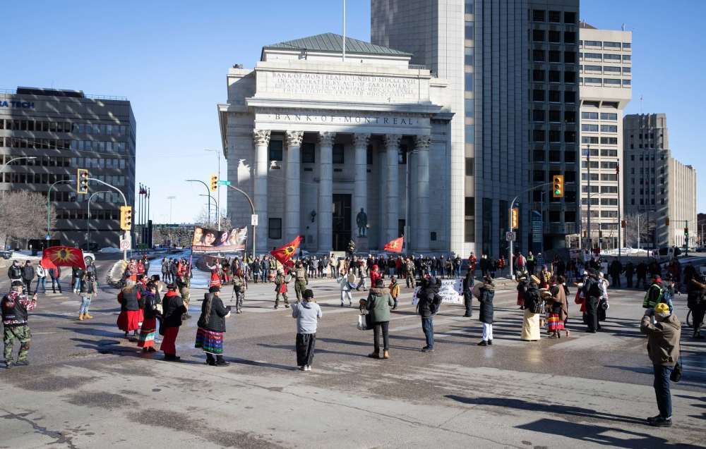 The demonstrators, led by Beardy’s family, then marched down Main Street to Winnipeg police headquarters on Graham Avenue.