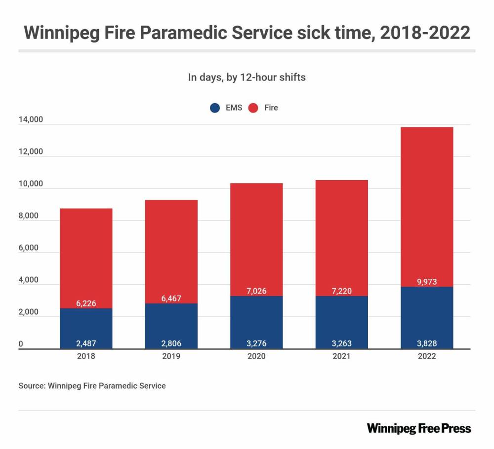 Fire paramedic service employees took 13,800.7 sick days in 2022, an increase from 10,482.8 in 2021, data provided by the service show. Firefighters took the bulk of those days at 9,972.7, while paramedics logged 3,828 days in sick time.