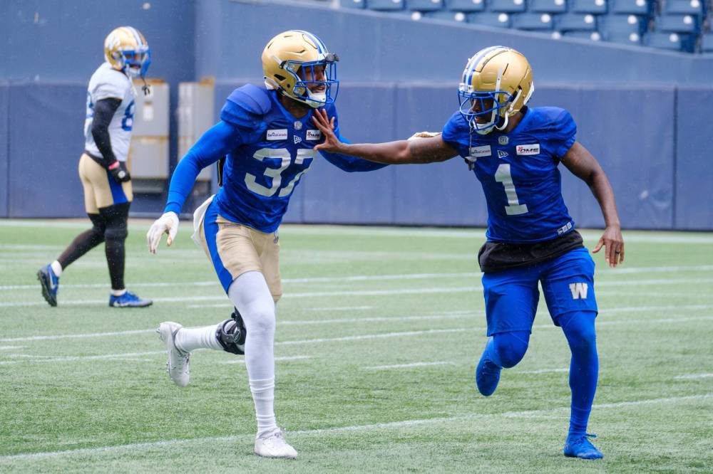 Winnipeg Blue Bombers’ Brandon Alexander (37) and Deatrick Nichols (1) during practice at IG Field Thursday morning.