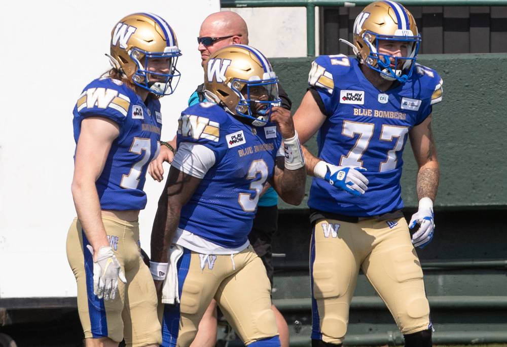 JASON FRANSON / THE CANADIAN PRESS Winnipeg Blue Bombers’ Karl Schmitz (74), quarterback Tyrrell Pigrome (3) and Gavin Garner (77) celebrate a touchdown against the Edmonton Elks during the second half.