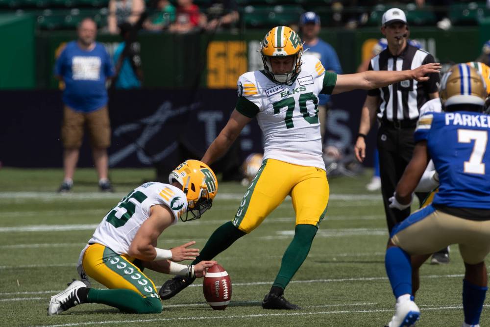JASON FRANSON / THE CANADIAN PRESS Edmonton Elks Dean Faithfull (70) makes the field goal against the Winnipeg Blue Bombers during the first half.