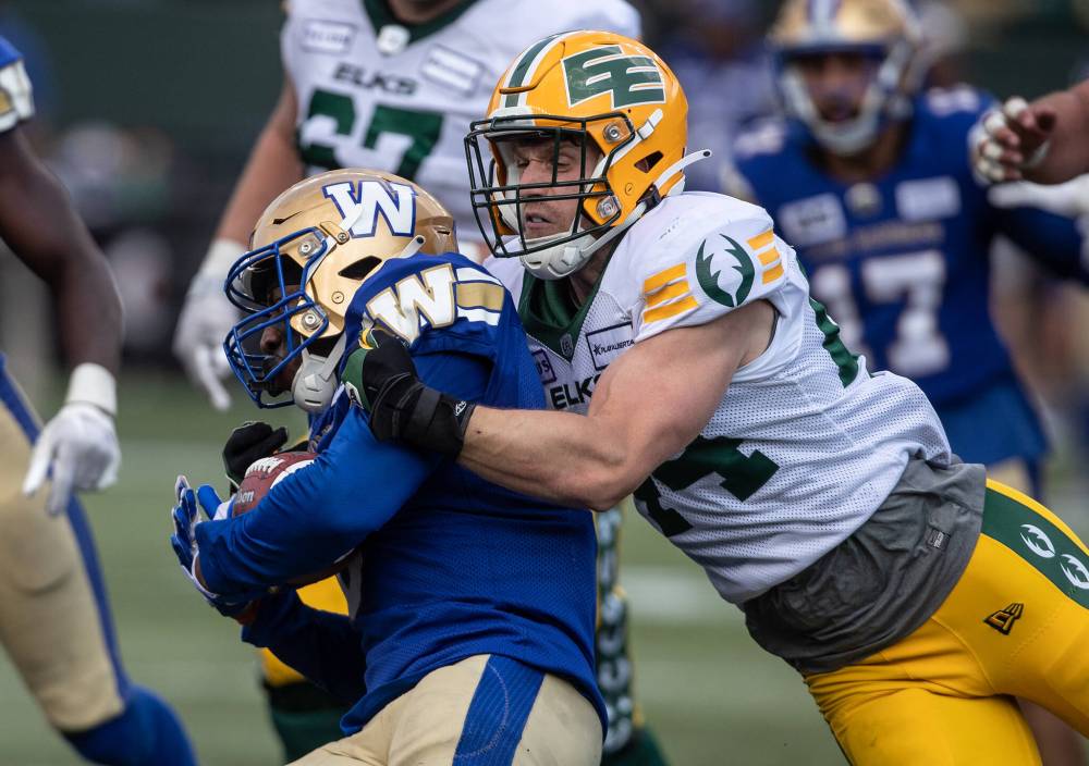 Winnipeg Blue Bombers’ Brandon Alexander (37) tackles Edmonton Elks’ Sammie Coates (89) during the first half.