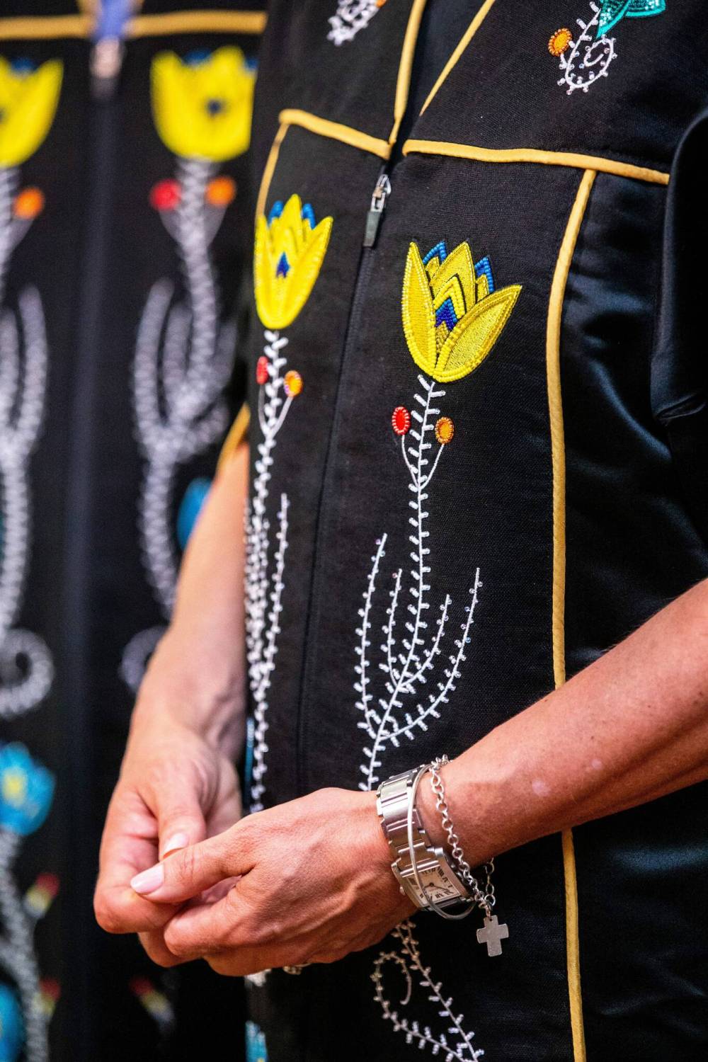 “I designed the robes with Ojibwa flower motifs, very, very strong roots going down into the land. The red circle symbolizes (missing and murdered Indigenous women and girls) and the orange symbolizes the children that never made it home (from residential schools),” artist Jackie Traverse said.