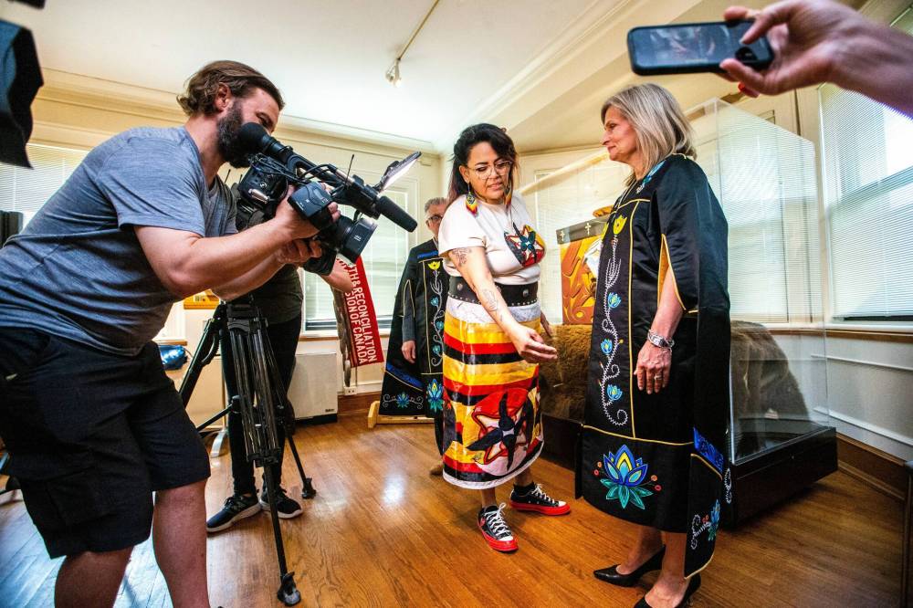 Speaking about the private ceremony, held before the news conference, chancellor Anne Mahon said Indigenous elders were present, and they informed the president and chancellor about the responsibility of wearing the robes and their significance was discussed in detail.