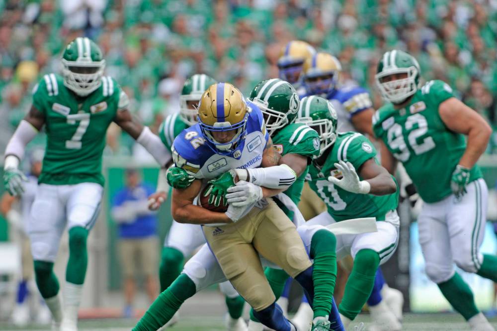THE CANADIAN PRESS FILES/Mark Taylor Winnipeg Blue Bombers wide receiver Drew Wolitarsky is tackled by the Saskatchewan Roughriders during CFL football action at Mosaic Stadium in Regina in 2018.