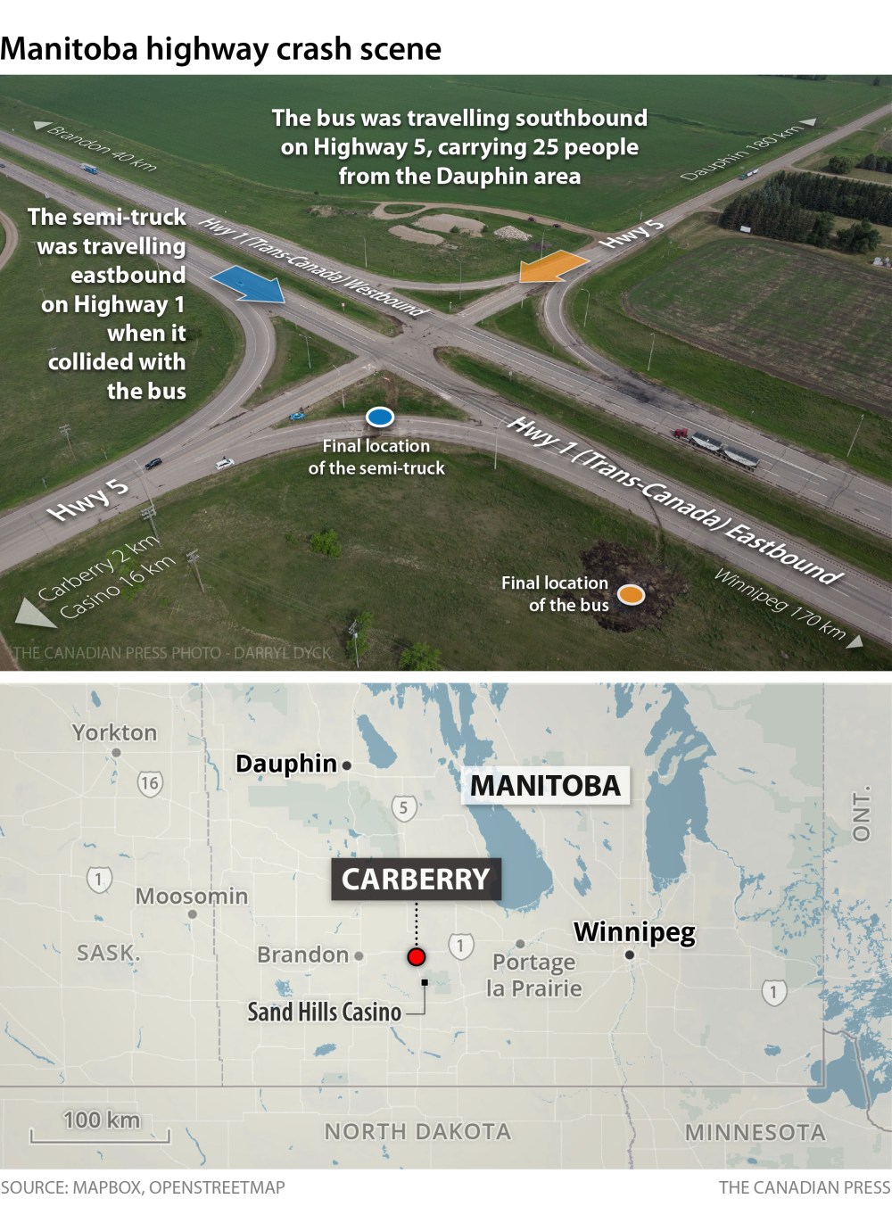 Manitoba’s chief medical examiner, Dr. John K. Younes, said his staff will use methods such as fingerprint analysis, dental records and surgical history to confirm the identities of the 15 who died because visual confirmation was not possible due to the injuries.