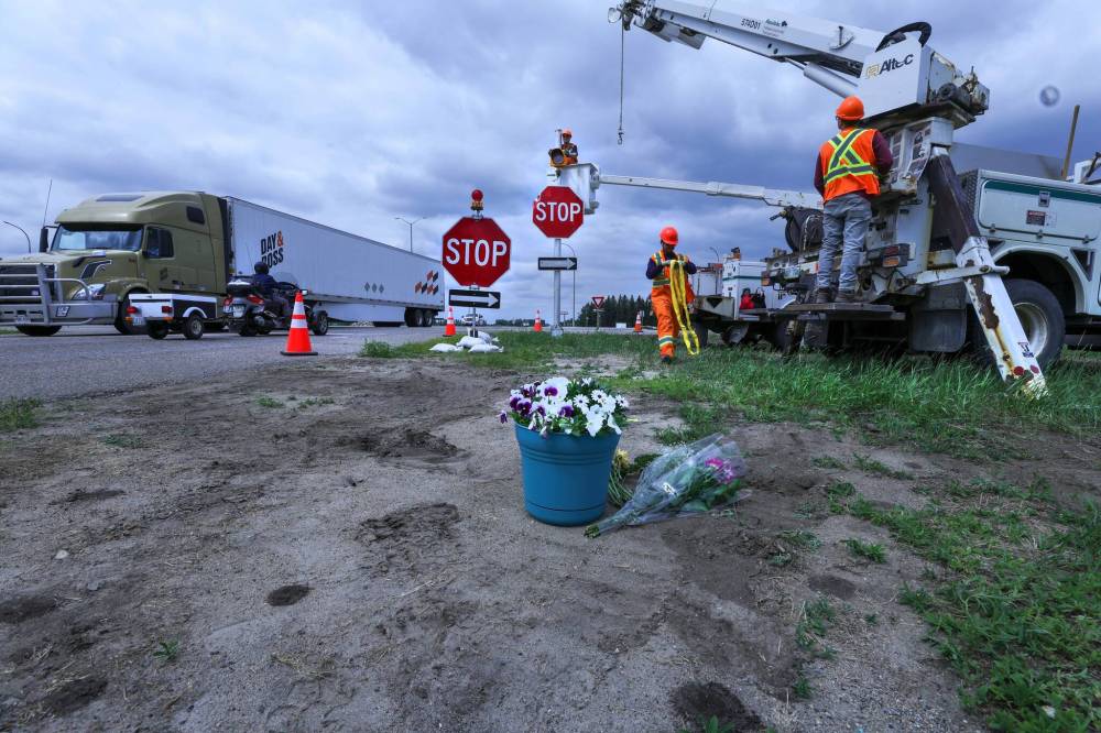 Fifteen seniors were killed and 10 others were injured June 15 when their minibus collided with a semi-trailer as it crossed the Trans-Canada Highway at Highway 5 shortly before noon. (Ruth Bonneville / Winnipeg Free Press)