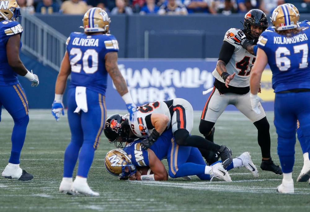 Winnipeg Blue Bombers quarterback Zach Collaros was sacked by the B.C. Lions seven times Thursday, including three times by Mathieu Betts, pictured here during the first half.
