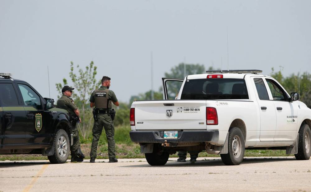 Conservation officers watch over a stand of trees for a coyote that mauled a small boy on Knowles Ave in Winnipeg’s Springfield North area, Sunday, June 25, 2023.
