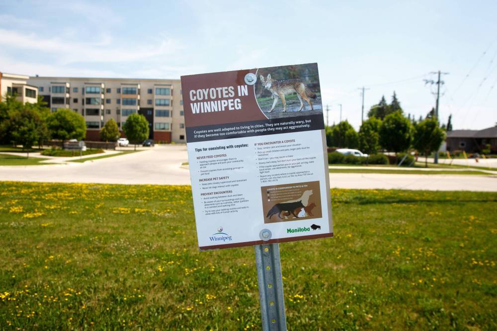 A sign warning passersby of coyotes is posted along the Northeast Pioneers Greenway in North Kildonan. The Greenway runs past the area where a coyote attacked a nine-year-old boy Saturday night.