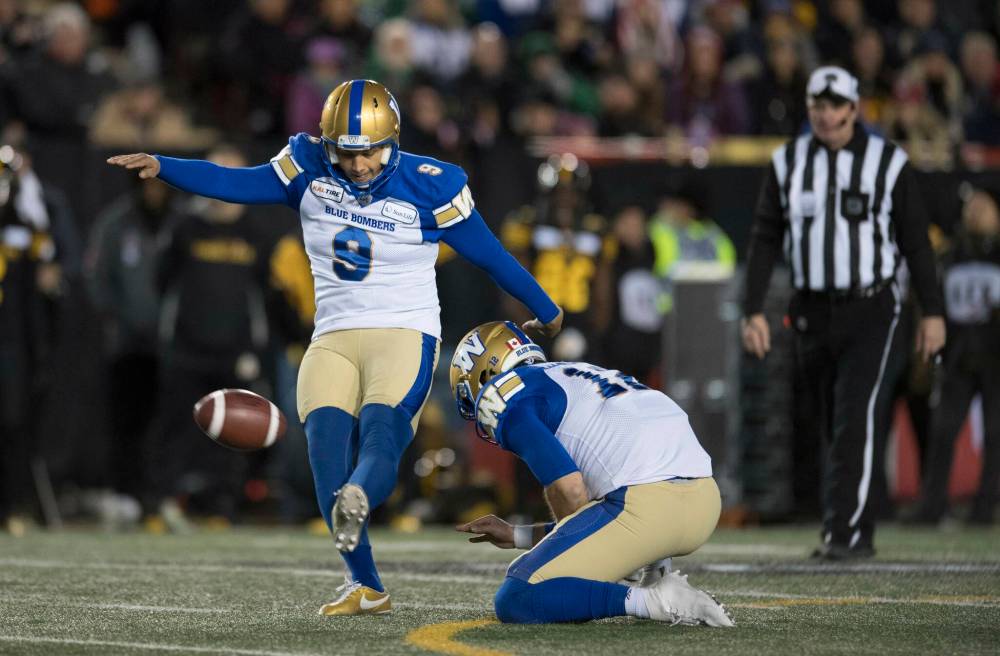 Winnipeg Blue Bombers kicker Justin Medlock kicks a field goal against the Hamilton Tiger-Cats during the 2019 Grey Cup. Medlock will be the lone member of the Bombers’ 2023 Hall of Fame Class.