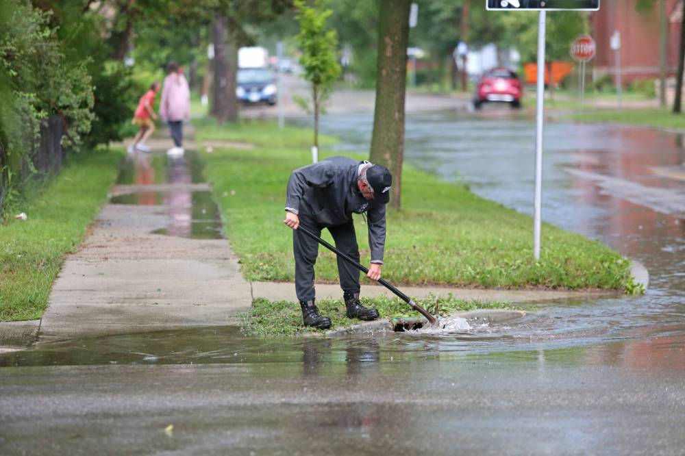 Brandon resident Gord Dupuis cleans out a clogged storm grate Tuesday afternoon, following a massive thunderstorm that flooded several streets in the city. (Matt Goerzen / The Brandon Sun)