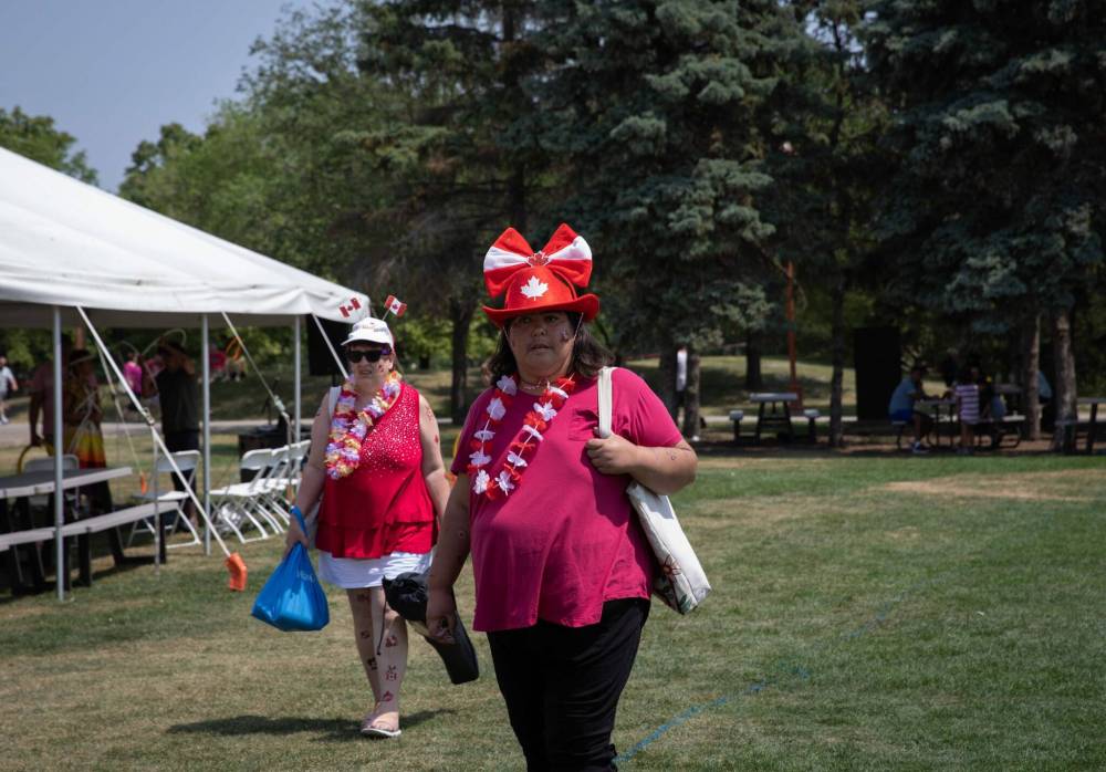 JESSICA LEE / WINNIPEG FREE PRESS Dawn Fidler (left) and Janice Soares wore red and white for the festivities at The Forks.