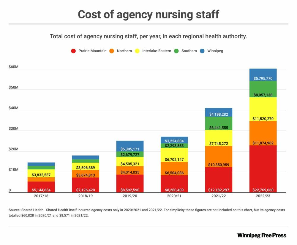 The province’s five regional health authorities spent a combined $60 million on agency nurses in the 2022-23 fiscal year, which represents an increase of 47 per cent over 2021-22, preliminary numbers provided by Shared Health show.