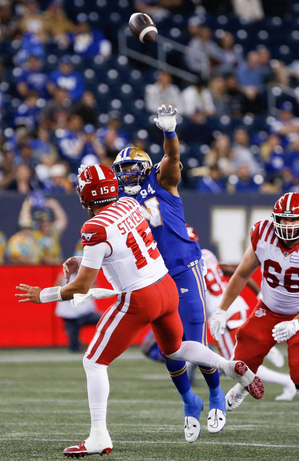 Winnipeg Blue Bombers’ Jackson Jeffcoat (94) pressures Calgary Stampeders quarterback Tommy Stevens (15) during second half CFL action in Winnipeg July 7. (John Woods / The Canadian Press)