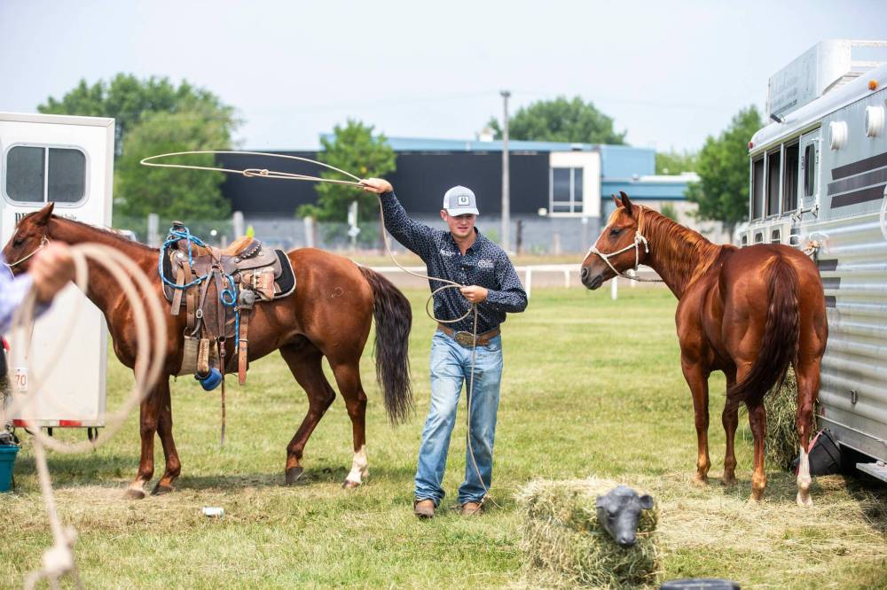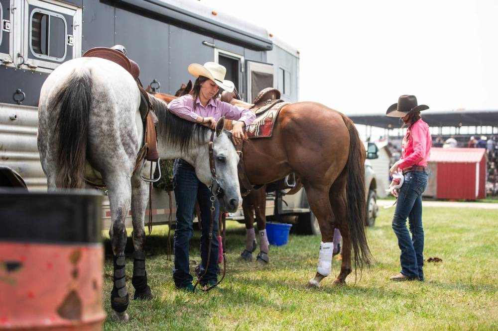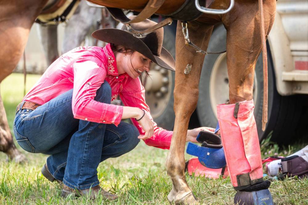 MORRIS — Brooke Wills was calm and quiet as she saddled her horse, cleaned the grit from its hooves and affixed splint and bell boots to protect its legs. In the distance behind her, thousands gathered within the grandstands of the Manitoba Stampede.