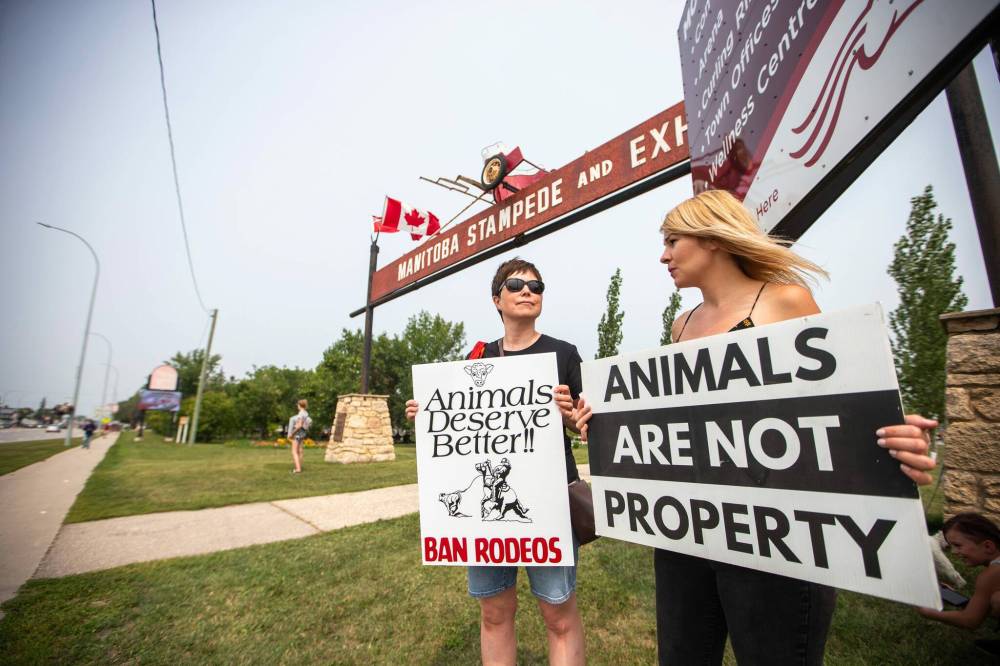 The demonstration was spurred, in part, by the death of a horse who was injured and then euthanized during a bronc riding event at the Triple S Fair & Rodeo in Selkirk on July 15.