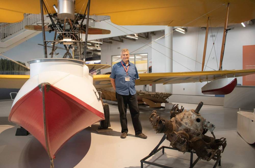 Jan Pedersen, who has been volunteering at the Royal Aviation Museum of Western Canada since its grand reopening in May 2022, with the Canadian Vickers Vedette Mark V, the museum’s oldest (and Pedersen’s favourite) aircraft.