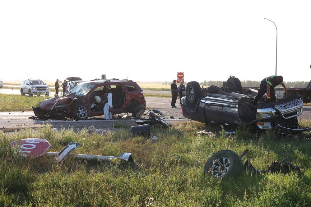 “Initial investigation has determined that a pickup truck southbound on Highway 5 entered the intersection at Highway 1, colliding with an eastbound SUV. The collision between the two caused the vehicles to push across the highway, where they collided with a third vehicle, which was waiting at a stop sign on Highway 5, south of Highway 1,” RCMP said in a news release.