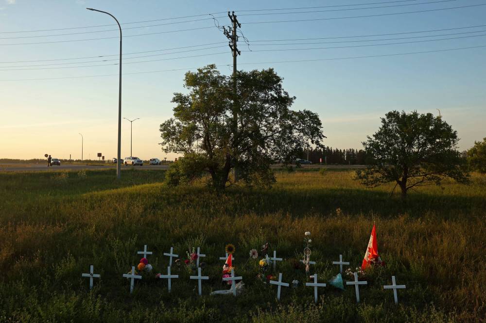 A memorial to the June 15 collision between a bus and a semi-truck that claimed the lives of 17 passengers sits just south of the intersection of the Trans-Canada Highway and Highway 5. (Tim Smith / The Brandon Sun)