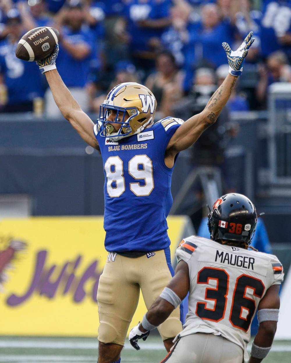 JOHN WOODS / THE CANADIAN PRESS Winnipeg Blue Bombers’ Kenny Lawler (89) celebrates his touchdown.