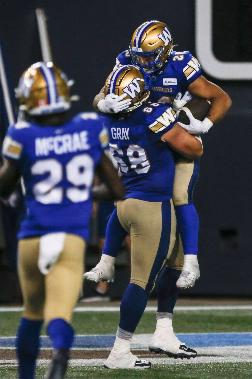JOHN WOODS / THE CANADIAN PRESS Brady Oliveira and Geoff Gray celebrate Oliveira’s touchdown.