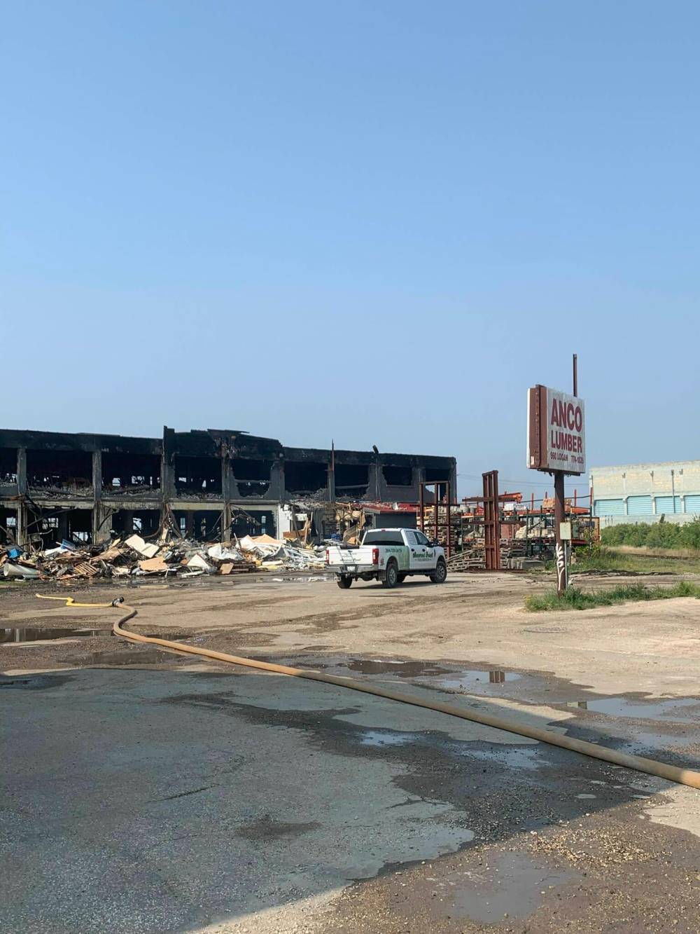 Crews were called to the scene at 1:36 a.m. Sunday after hearing reports of a large commercial fire at the Anco Lumber building. They stayed on-site overnight while a demolition crew helped remove parts of the building so firefighters could access hotspots.