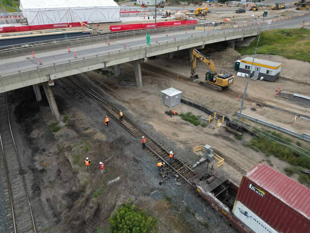 Crews work at the scene of a train derailment at the Daly overpass on Thursday morning.