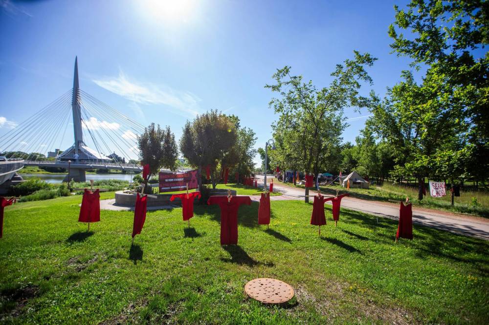 Red handprints colour the concrete on the nearby Provencher Bridge. Red dresses fastened onto crosses sway in the morning breeze. Red ribbons dangle from trees. All draw attention to the horror that is missing and murdered Indigenous women, girls and two-spirited people.