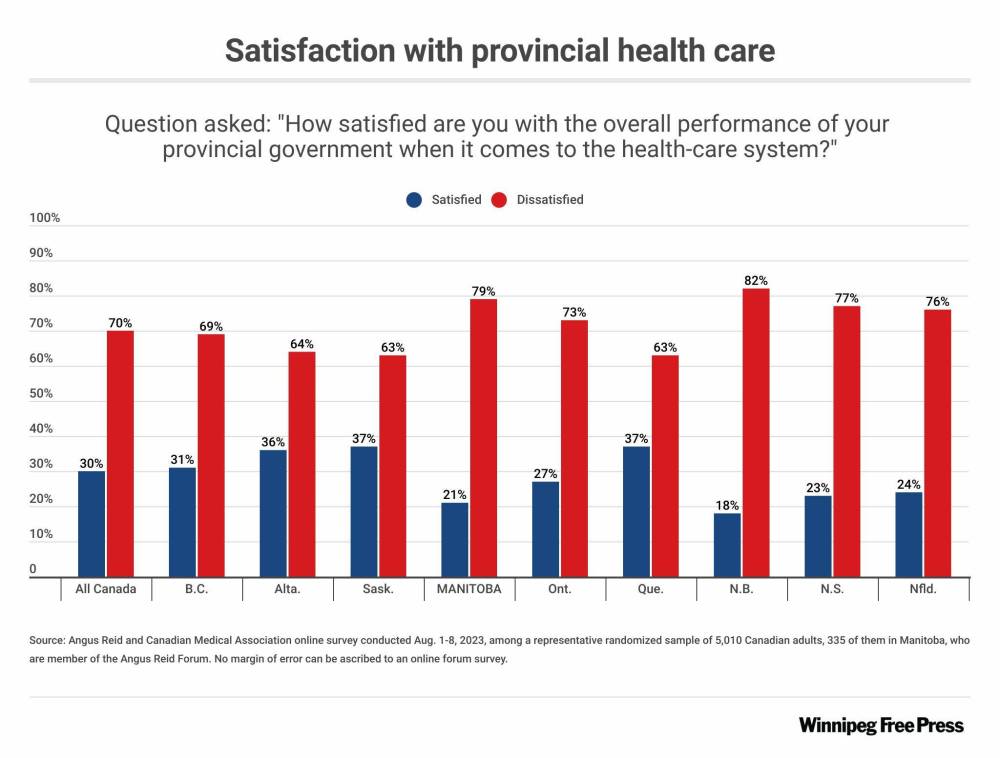 The poll found only 21 per cent of Manitobans are very or moderately satisfied with the provincial government’s handling of health care, second only across the country to New Brunswick at 18 per cent. Saskatchewan and Quebec, both at 37 per cent, are most satisfied.