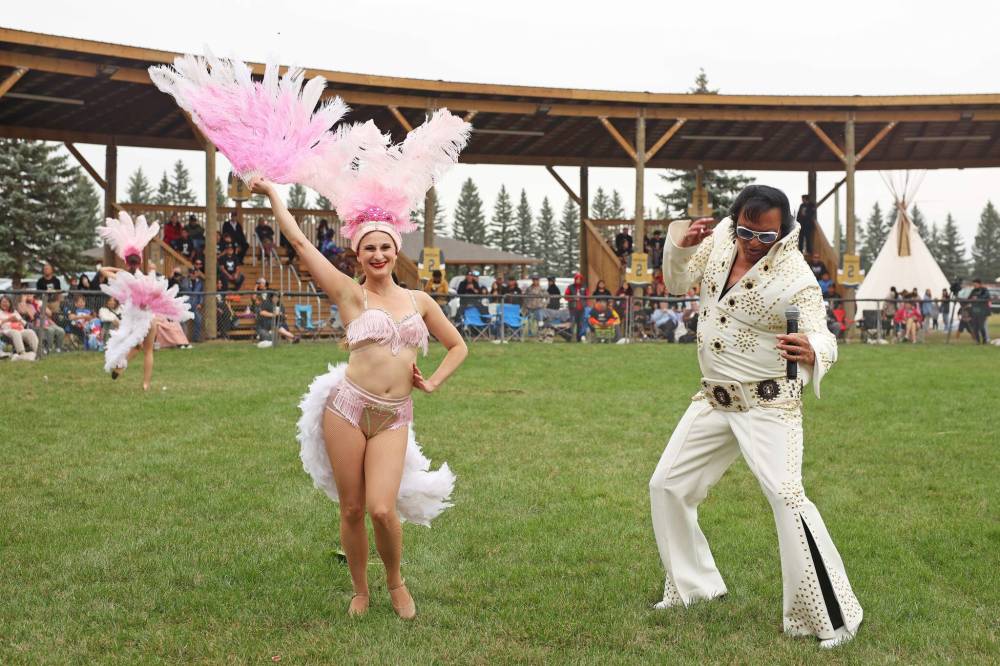 Ojibway Elvis performs for the crowd with dancer Meagan Funk beside him at the Sioux Valley Dakota Nation powwow arbour. (Tim Smith / The Brandon Sun)