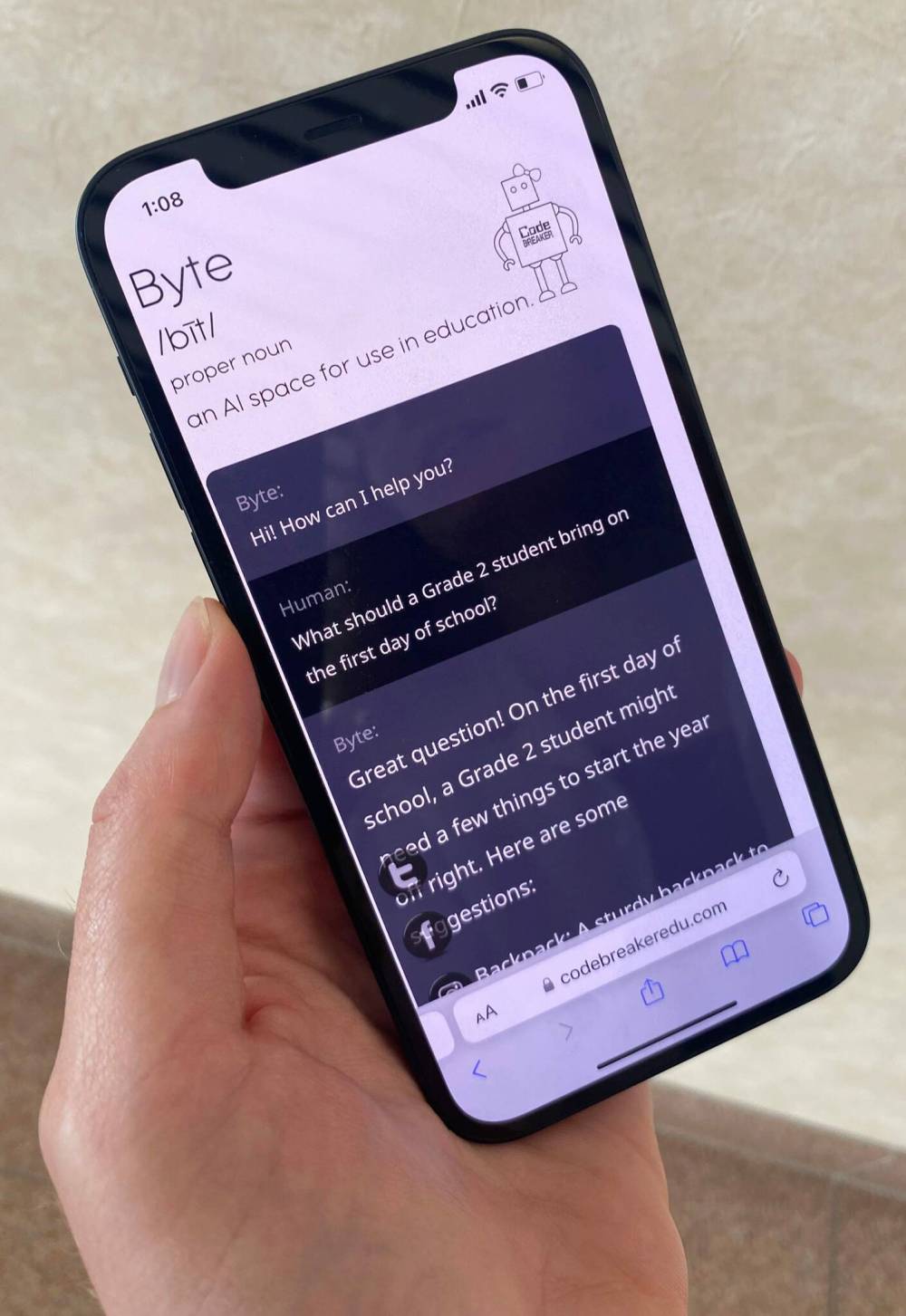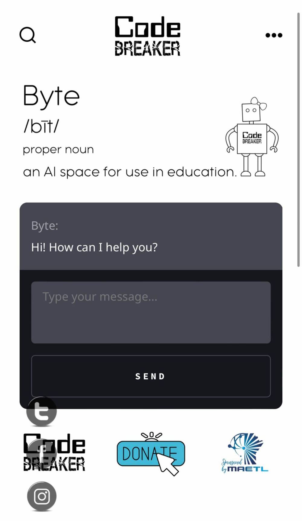 BYTEAI ByteAI, a new artificial intelligence chatbot — available free of charge via codebreakeredu.com/chat/ — was designed in collaboration with Manitoba teachers with a goal of creating a time-saving tool that can assist with lesson planning and building digital literacy.