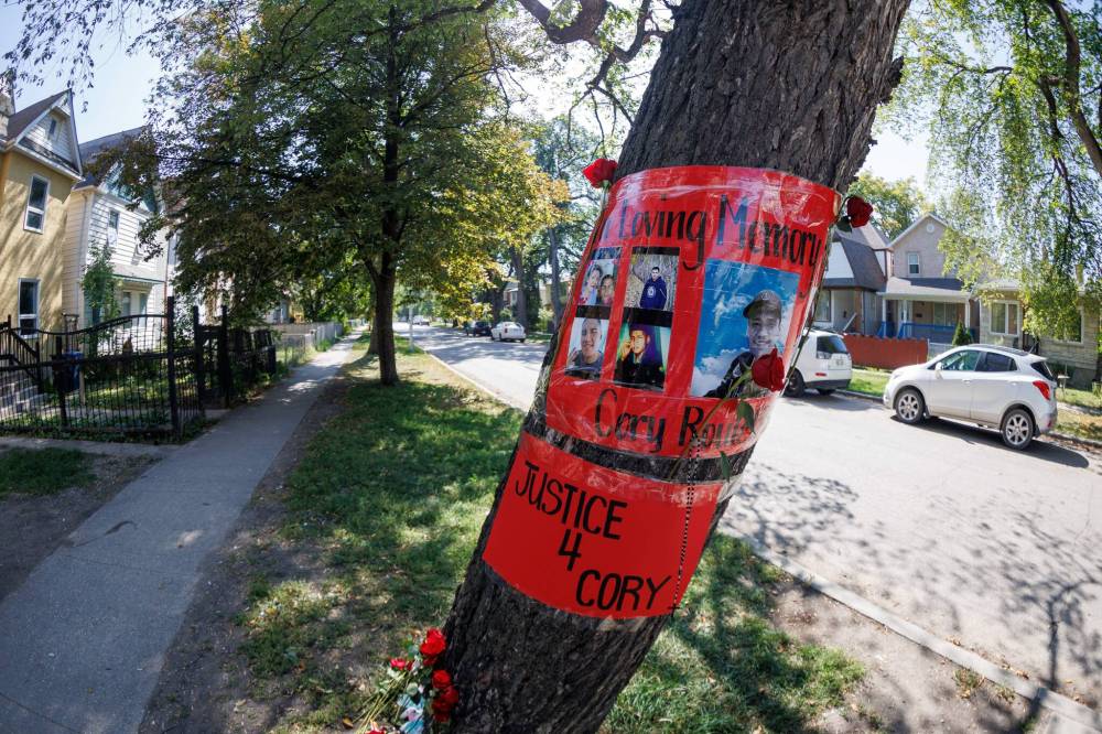 A memorial, for Cory Roger Roullete, 38, is taped to the tree outside the building where he was killed on 583 Furby Street.