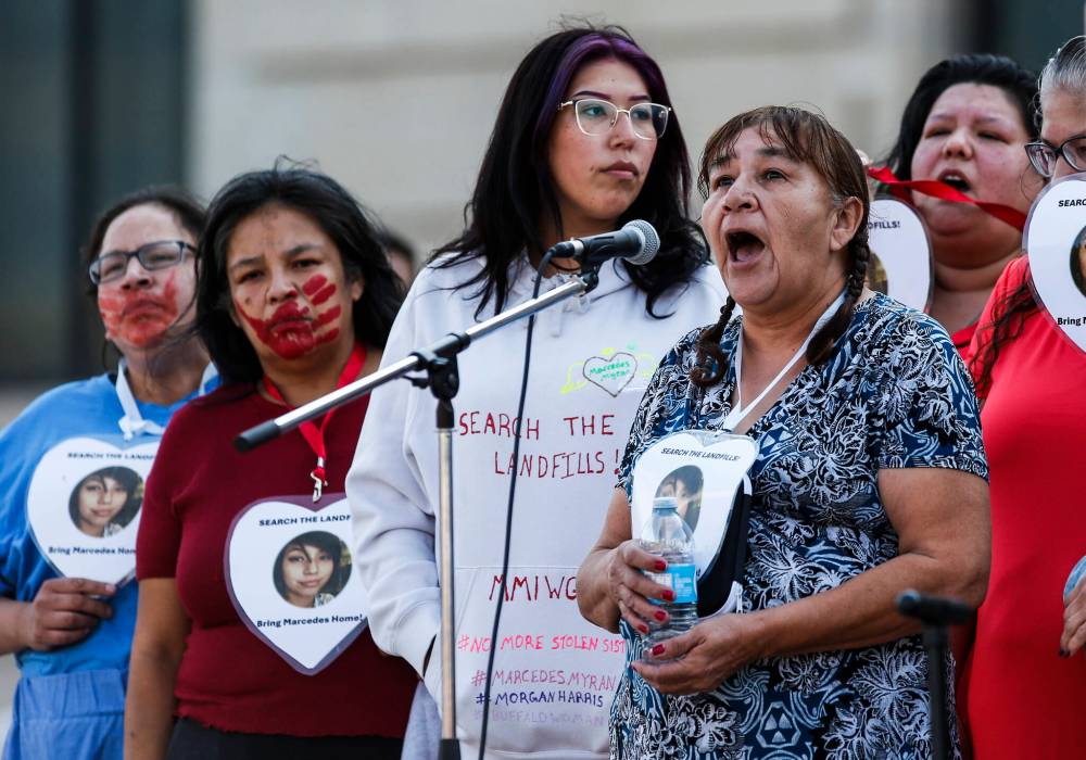 Signage and speeches focused on two First Nations women, Morgan Harris and Marcedes Myran — who Winnipeg police say are victims of an accused serial killer and whose remains are believed to be in the Prairie Green landfill north of the city.