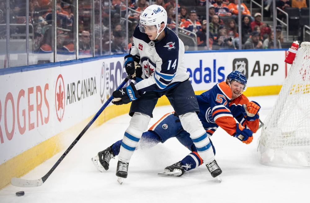 Winnipeg Jets’ Ville Heinola (14) checks Edmonton Oilers’ James Hamblin (57) during the second period in Edmonton on Sunday.