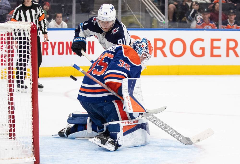 Winnipeg Jets’ Cole Perfetti (91) scores the game-winning goal against Edmonton Oilers goalie Olivier Rodrigue (35) during a shootout in NHL preseason action in Edmonton on Sunday.
