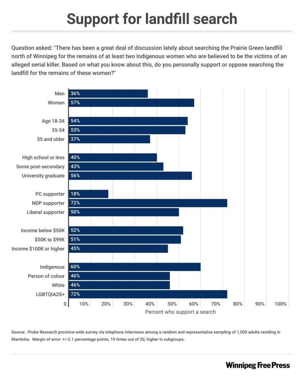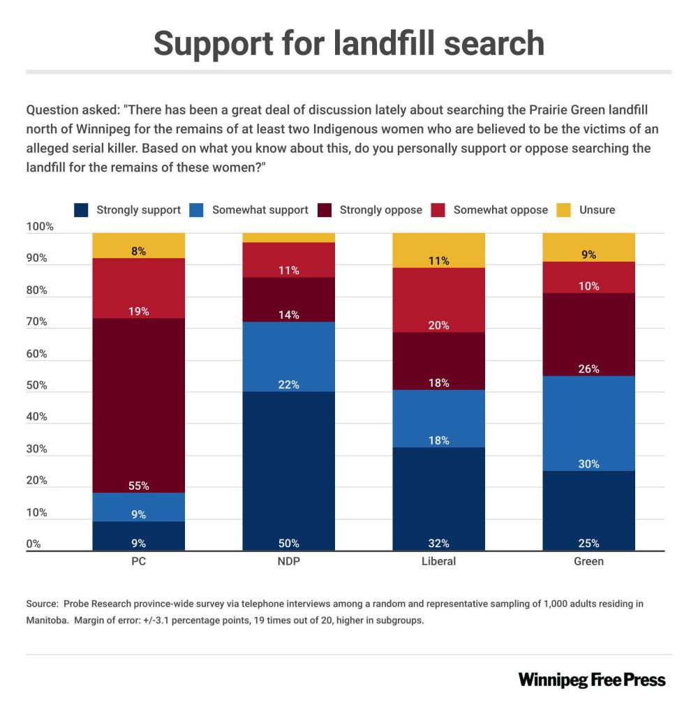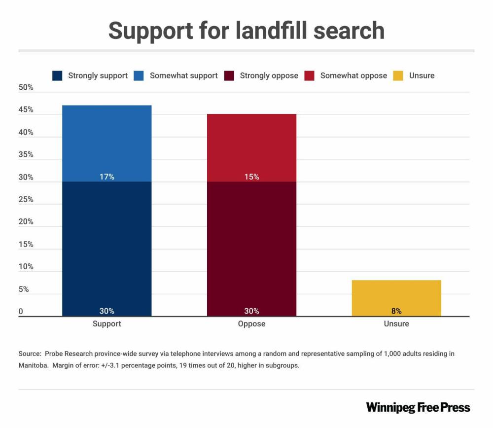 A Free Press-CTV poll conducted by Probe Research found that a slightly larger group of Manitobans — 47 per cent — support searching the Prairie Green landfill north of Winnipeg than those who are opposed, at 45 per cent. Eight per cent said they were unsure.