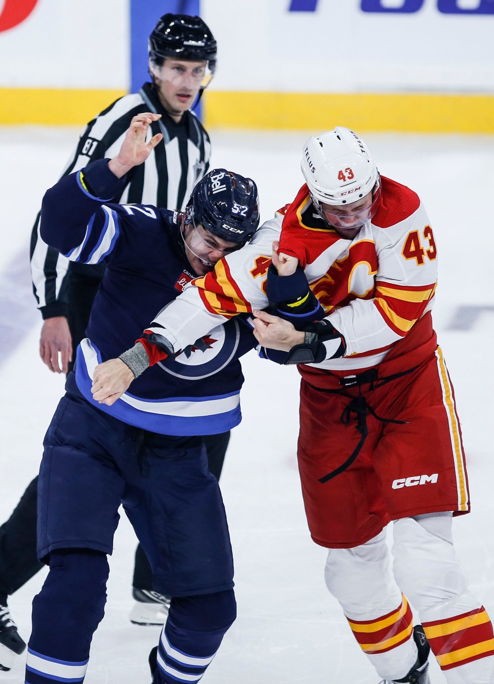 Jets defenceman Tyrel Bauer and Flames forward Adam Klapka dropped the gloves just 80 seconds into the game and had a spirited tilt at centre ice. There was no obvious issue leading up to the bout, but it’s worth noting there is a history between the pair.