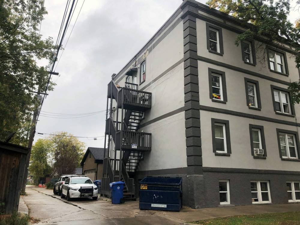 Winnipeg Police Service patrol cars outside 635 Mulvey Ave., where Damion Wayne Skrumeda, 46, was shot dead in his basement suite in the apartment. (Erik Pindera / Winnipeg Free Press files)
