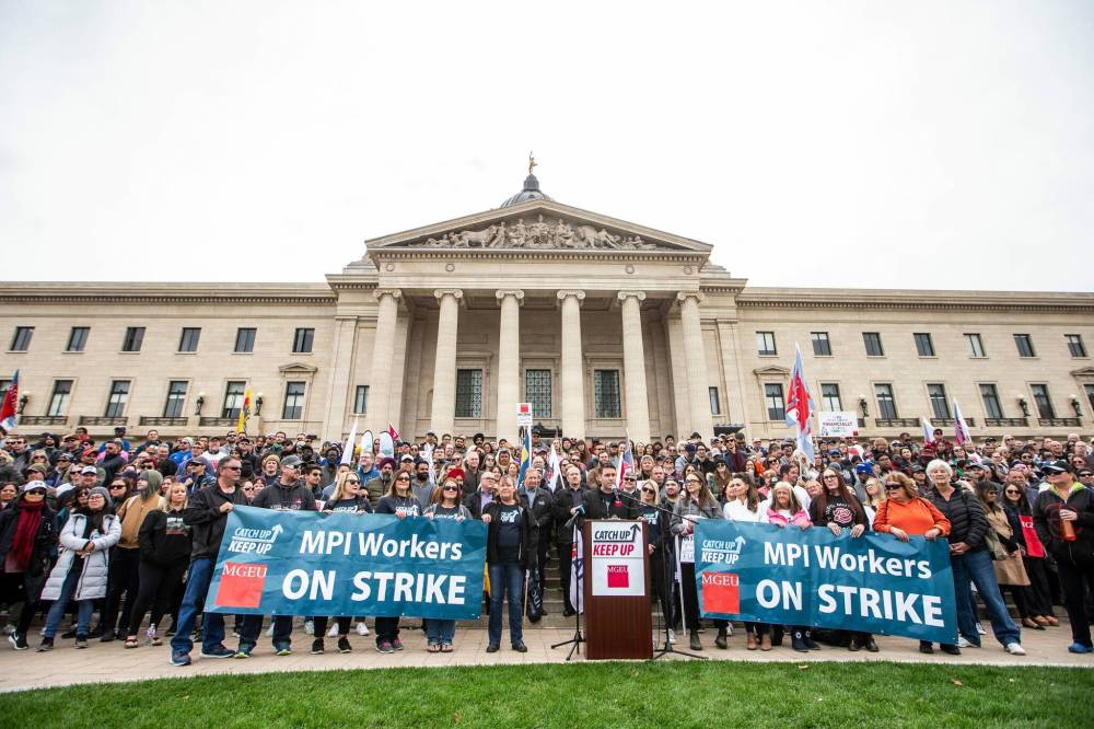 While it was the fifth rally the Manitoba Government and General Employees’ Union has held at the Legislative Building since Liquor and Lotteries workers first hit the picket line in August, it was the first since NDP premier-designate Wab Kinew was elected Oct 3.
