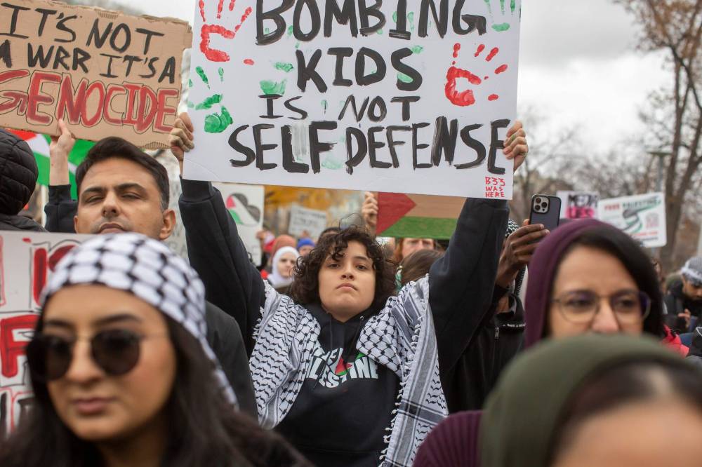 Speeches before the march were briefly derailed by about a dozen counter-protesters, who carried Israel flags and signs reading, “Turn Hamas into hummus” and “We stand with Israel,” from the Legislative Building and called to the pro-Palestine rally using a megaphone.