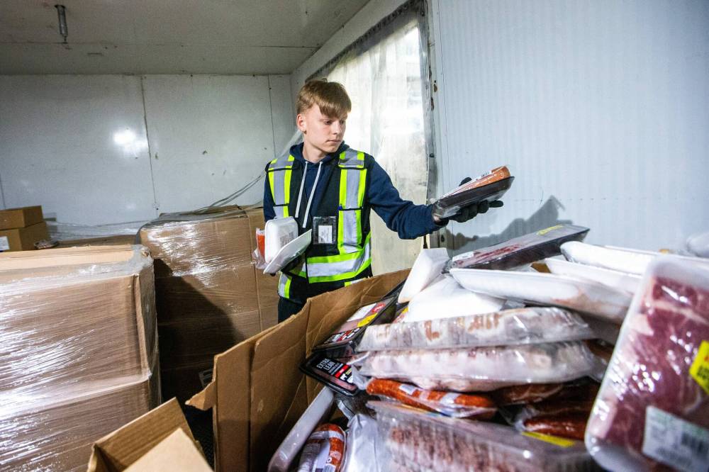 Volunteer Rouven Hoffmann stocks the freezer with meat at Harvest Manitoba.