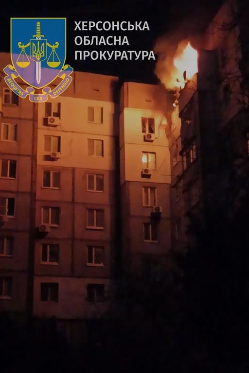 The overnight shelling set fire to a high-rise apartment building, blew out windows and reduced some apartments to rubble, according to video footage posted by Kherson Gov. Oleksandr Prokudin.