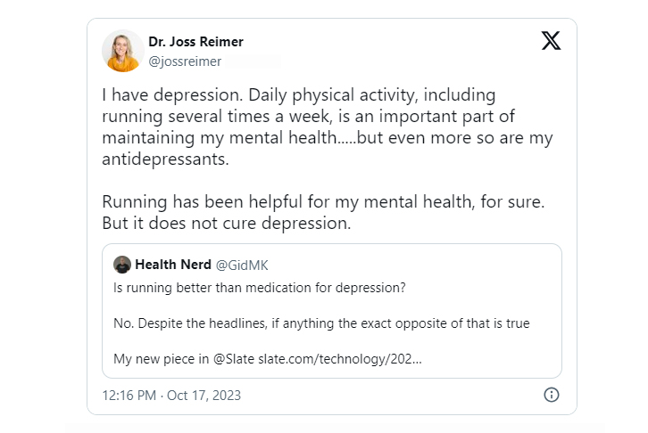 “Running has been helpful for my mental health, for sure. But it does not cure depression," Reimer wrote on X.